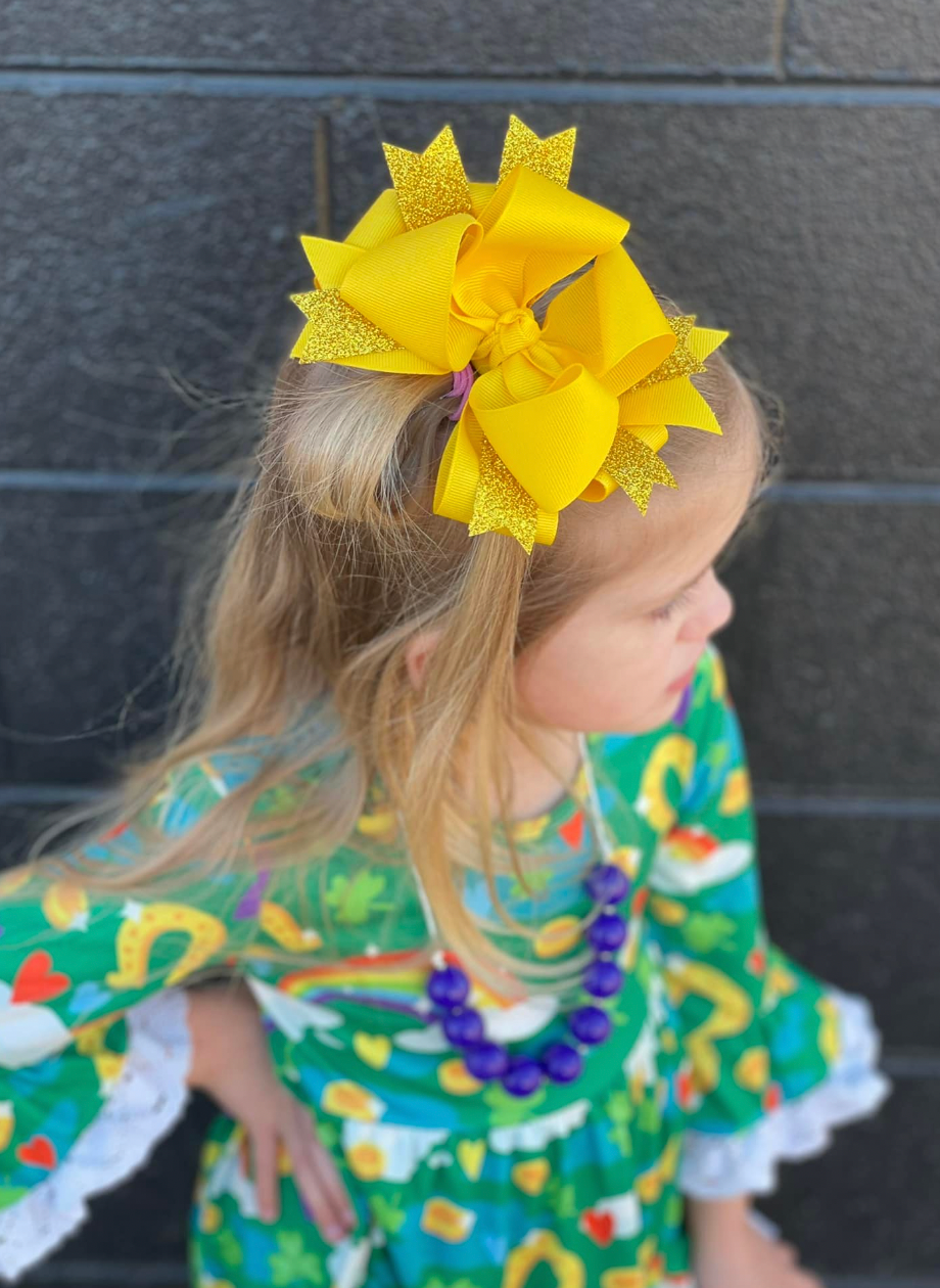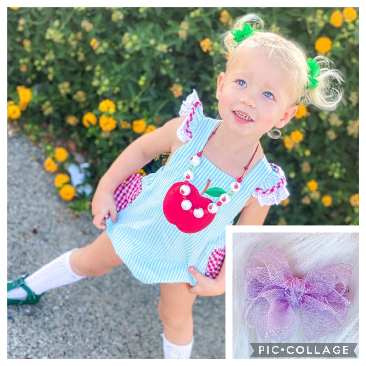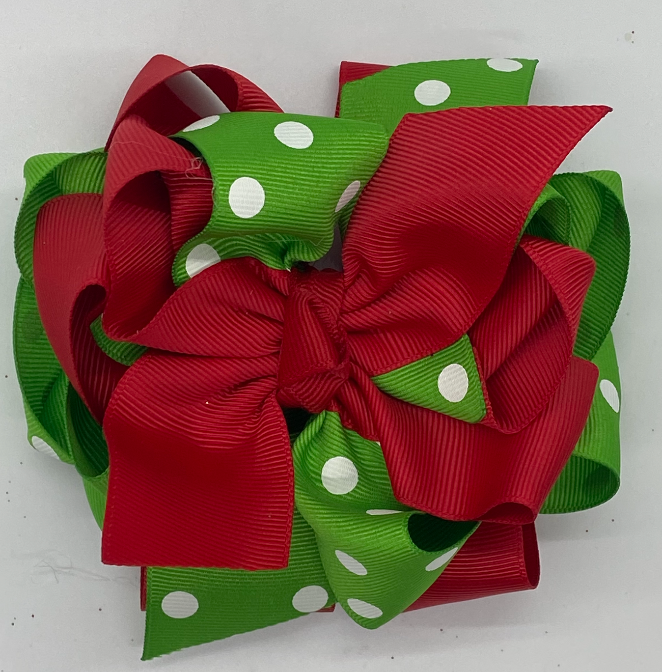 Allie is wearing our most popular bow, the Classic Double. This double has a bottom and top bow and glitter tails can be added. Tiny Toppers can be added to the center of the bow for different occasions. This bow can be made in three sizes (4, 5 and 6 inch). Solids, mixied solids and patterns make this bow the favortie of many!