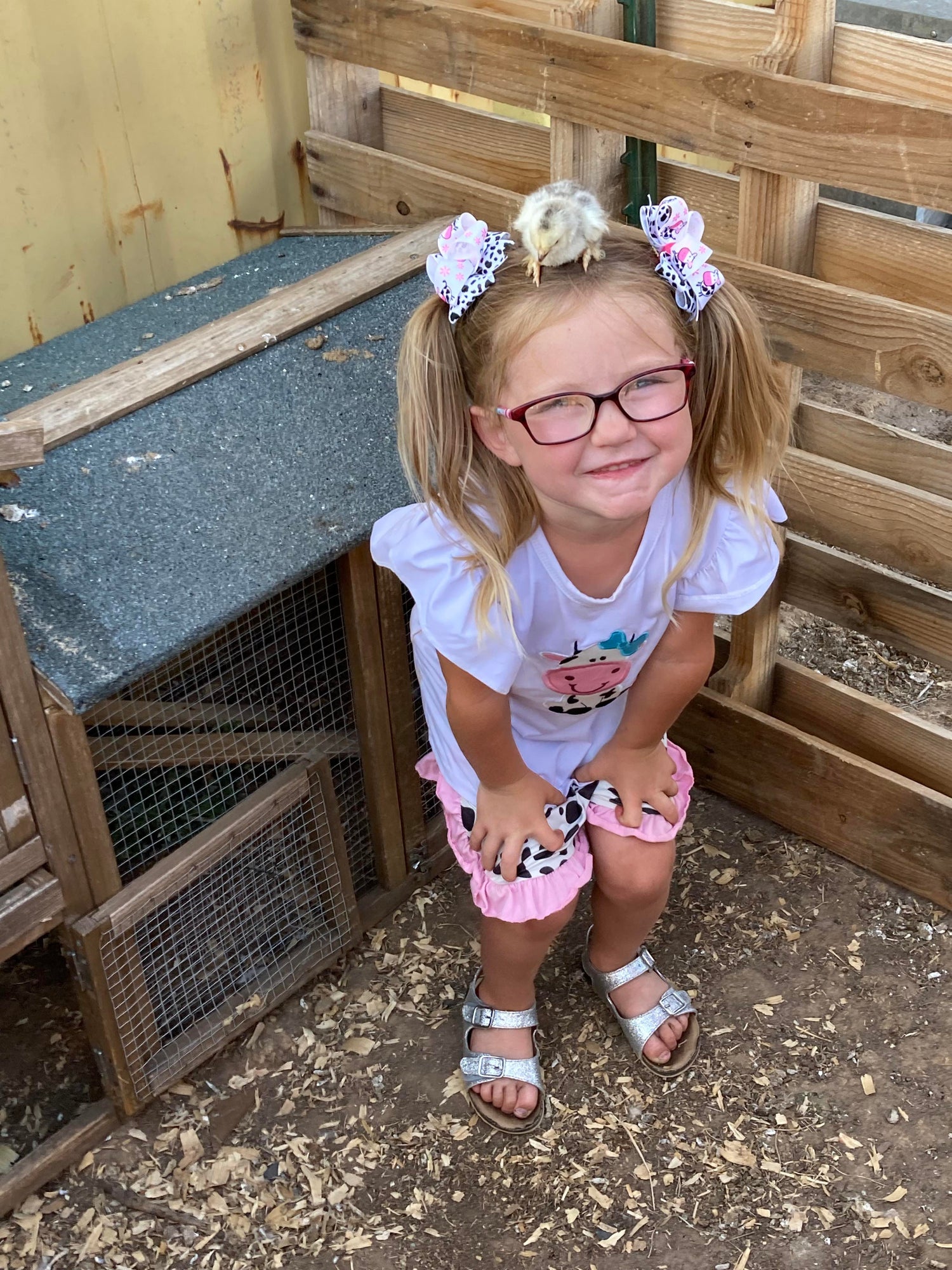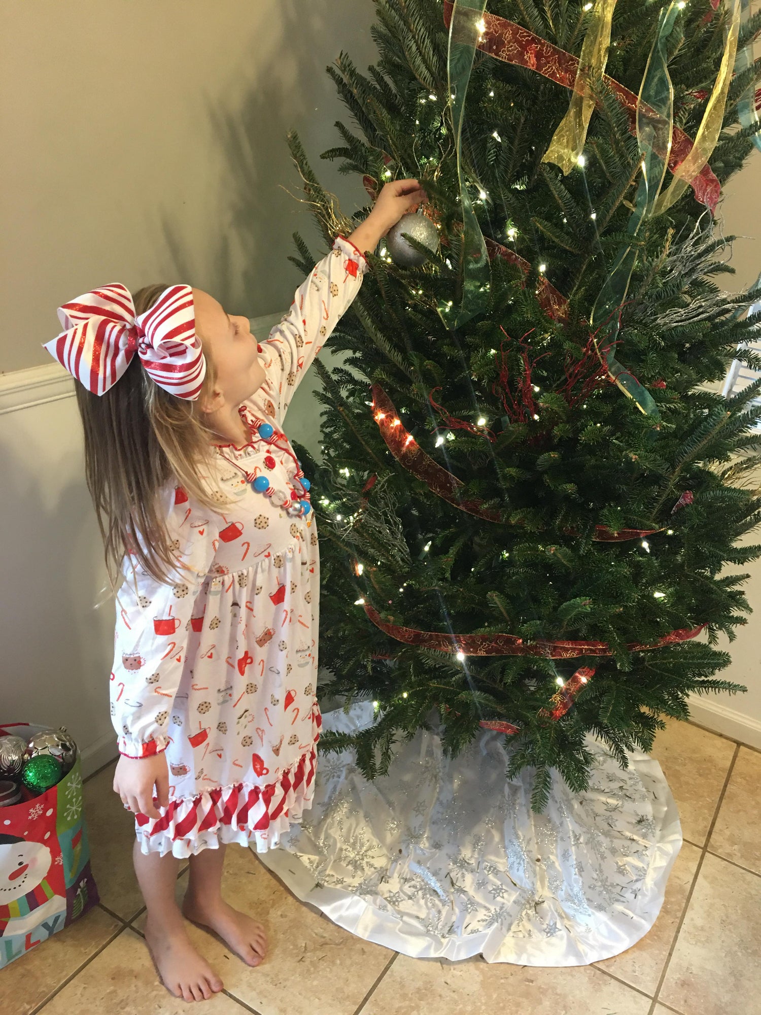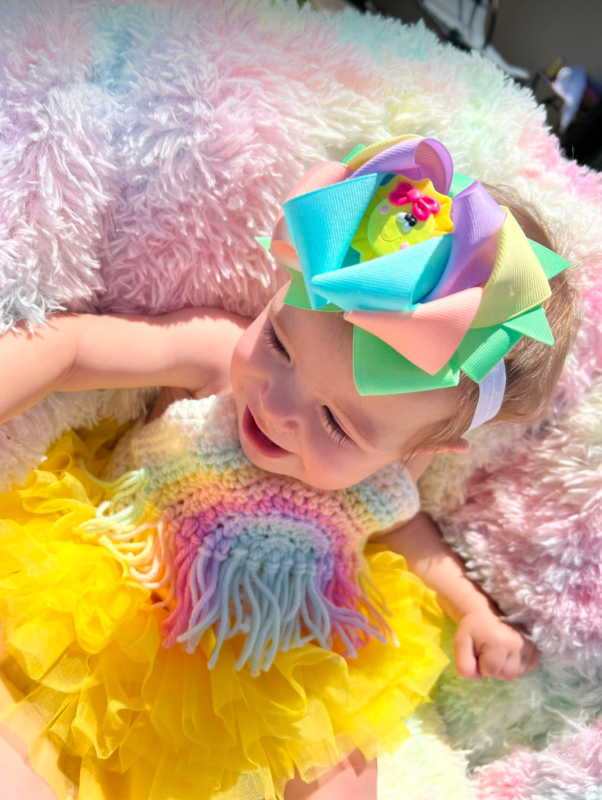 Allie is wearing our most popular bow, the Classic Double. This double has a bottom and top bow and glitter tails can be added. Tiny Toppers can be added to the center of the bow for different occasions. This bow can be made in three sizes (4, 5 and 6 inch). Solids, mixied solids and patterns make this bow the favortie of many!